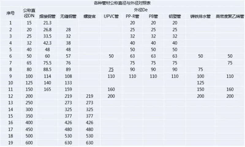 水煤氣輸送鋼管(鍍鋅或非鍍鋅)、鑄鐵管等管材,管徑宜以公稱直 徑DN表示; 無縫鋼管、焊接鋼管(直縫或螺旋縫)、銅管、不銹鋼管等管材,管徑宜以外徑×壁厚Φ表示; 鋼筋混凝土(或混凝土)管、陶土管、耐酸陶瓷管、缸瓦管等管材, 管徑宜以內徑 d 表示; 塑料管材,管徑宜按產品標準的方法表示; 當設計均用公稱直徑 DN 表示管徑時,應有公稱直徑 DN 與相應產品規格對照表。