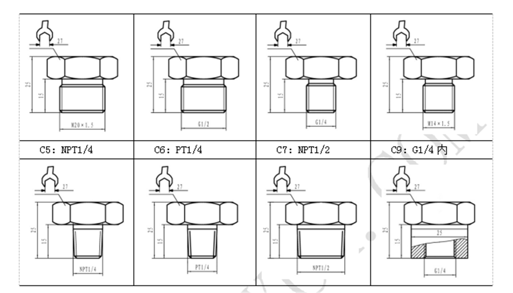 | 型號 | 量程 | 精度 | 輸出信號 | 螺紋接口 | 電氣連接 | 其它要求 |