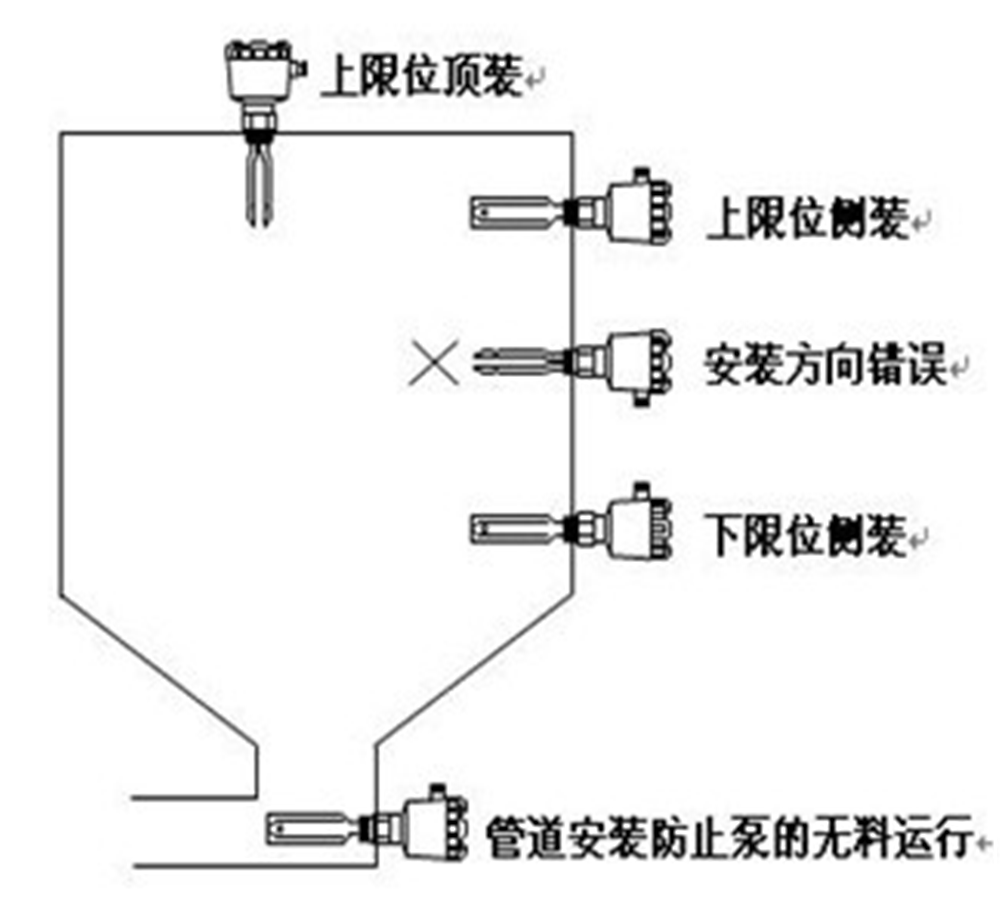 8、音叉限位開關通常采用側裝方式安裝與倉體側壁對料高度進行上下限位置檢測,當倉體不便側面開孔時可采用頂裝,位置選擇能避開料位沖擊的位置。