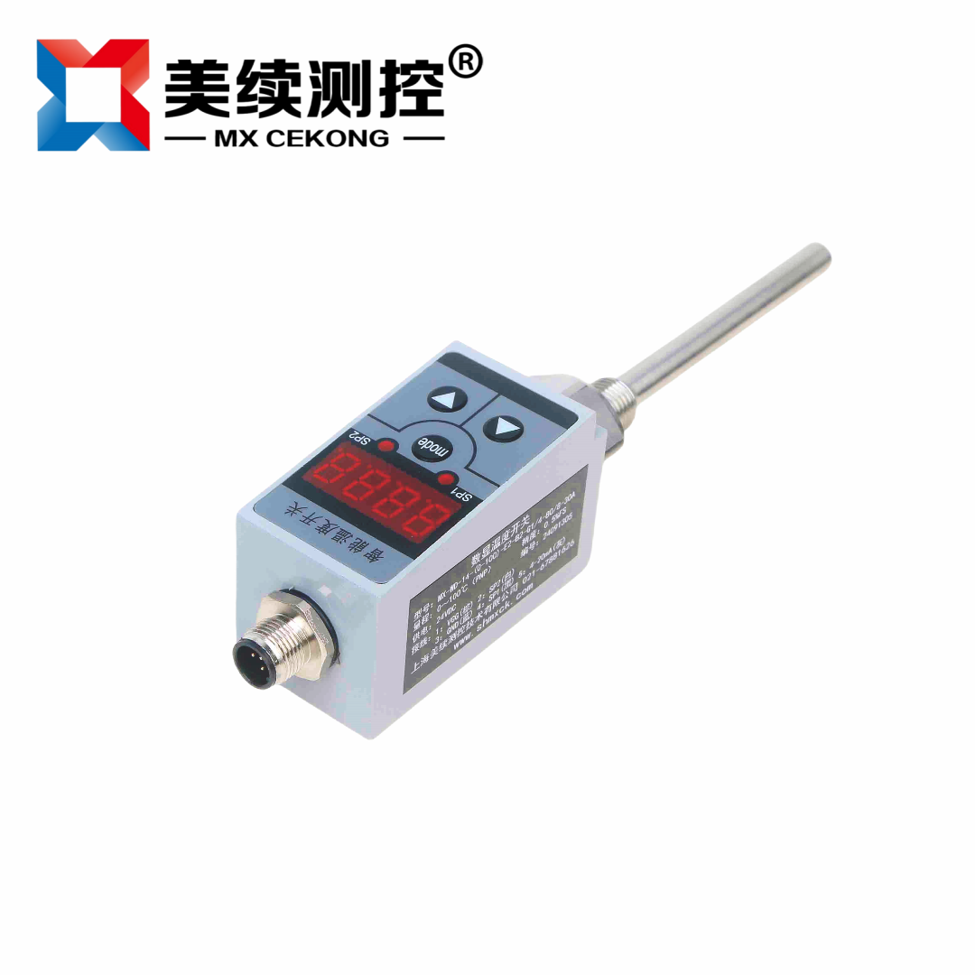 MX-WD-08 智能溫度開關(guān)是集溫度測量,顯示,輸出、控制于一體的智能數(shù)顯溫度測控產(chǎn)品。該產(chǎn)品為全電子結(jié)構(gòu),前端采用PT100溫度傳感器,輸出信號由高精度,低溫漂的放大器放大處理,送入高精度的A/D轉(zhuǎn)換器,轉(zhuǎn)換成微處理器可以處理的數(shù)字信號,經(jīng)過運算處理的信號控制兩路開關(guān),對控制系統(tǒng)溫度進行測控。該智能數(shù)字溫度開關(guān)使用靈活,操作簡單,調(diào)試容易,安全可靠。廣泛應(yīng)用于水電,自來水,石油,化工,機械,液壓等行業(yè),對流體介質(zhì)的溫度進行測量顯示和控制。