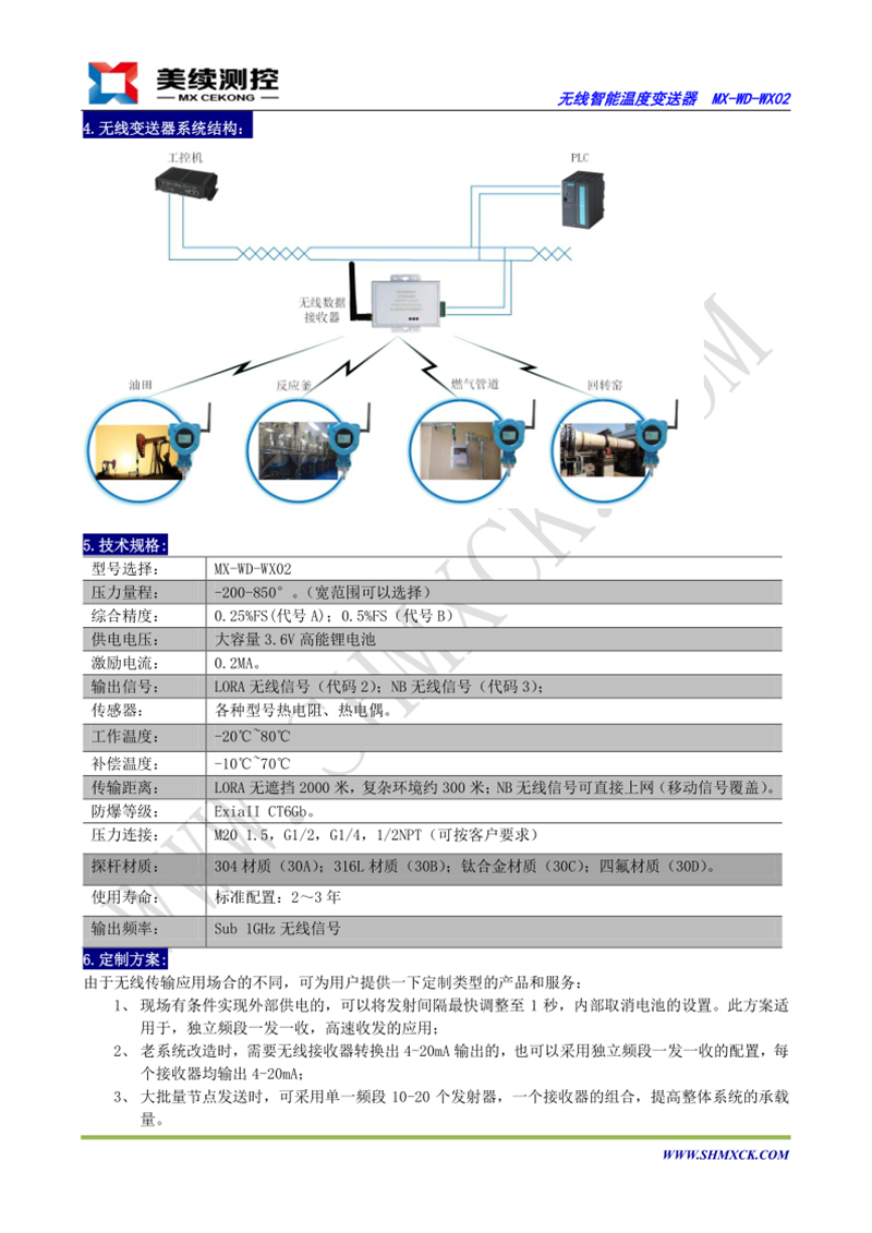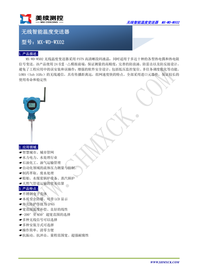 MX-WD-WX02無線溫度變送器采用FSTN高清晰段碼液晶,同時適用于多達十種的各型熱電偶和熱電阻信號變送。