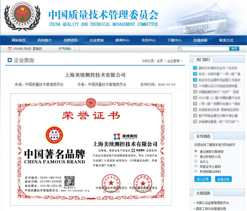 2019年的最后一天,上海美續測控技術有限公司被中國質量技術管理委員會和中國品牌戰略推進協會同時授予“中國著名品牌”榮譽稱號,成為同行業中誠信生產經營的典范。